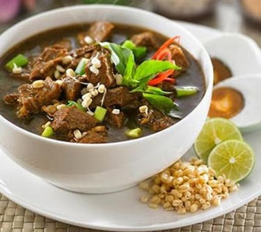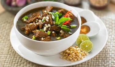Rawon: A uniquely deep black beef soup. The color comes from the use of black keluak nuts (Pangium edule). It is rich, savory, and aromatic, typically served with sprouts, salted egg, and rice.