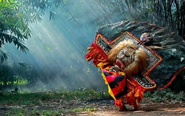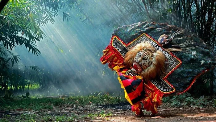 Reog Ponorogo: A spectacular and powerful dance originating from Ponorogo, featuring massive lion masks adorned with peacock feathers, weighing up to 50 kg, often carried solely by the dancer's teeth and neck.