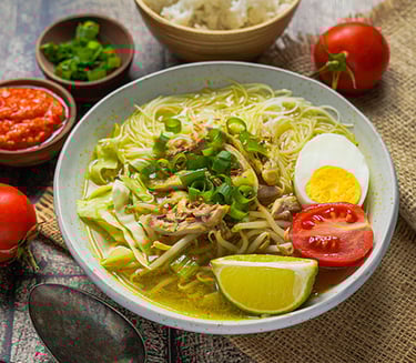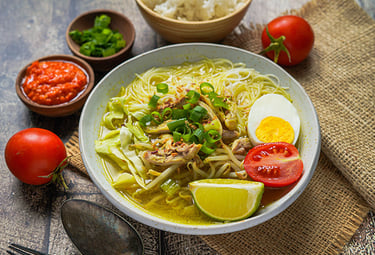 Soto Lamongan: A famous chicken soup from Lamongan, distinguished by its vibrant yellow color and the topping of koya (a savory powder made from dried shrimp and garlic crackers), giving the broth a rich, thick texture.