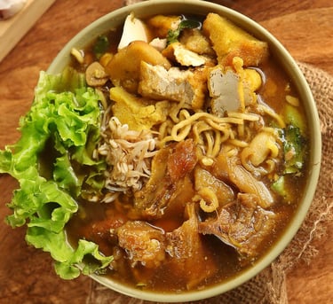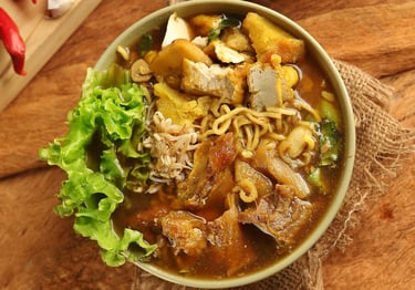 Tahu Campur: A savory street food dish, consisting of sliced fried tofu, lontong (rice cake), bean sprouts, noodles, and thin slices of fried beef/mutton, all served in a thick, dark, and highly flavorful petis-based broth.