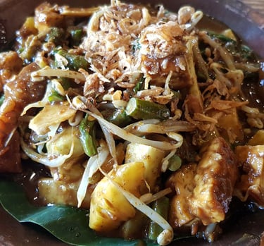 Rujak Cingur: A distinct salad featuring mixed vegetables, tofu, tempeh, rice cake (lontong), and the unusual addition of cow snout or lips (cingur). It is dressed with a thick, savory-sweet sauce made from peanuts and spicy shrimp paste (petis).