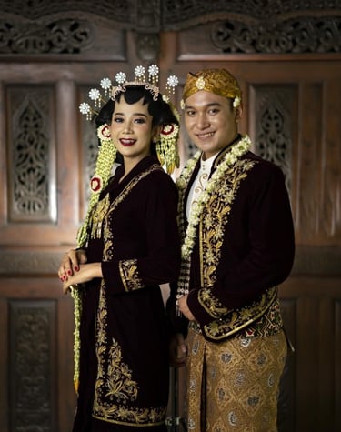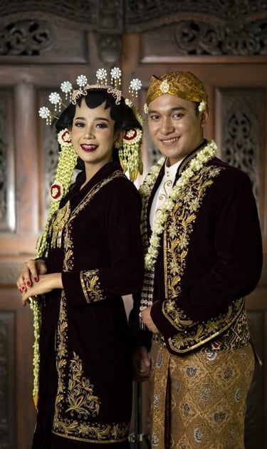 Men wear a formal beskap (a high-collared jacket) with a blangkon (traditional Javanese headpiece), and women wear an elaborate kebaya and jarik (batik cloth), often complemented with sophisticated embroidery and gold thread.