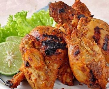Ayam Iloni: Grilled chicken that is first marinated in a rich mixture of coconut milk, ginger, turmeric, and garlic. The coconut milk marinade creates a savory, slightly creamy glaze on the charred chicken.