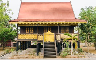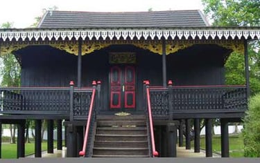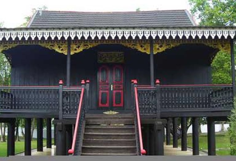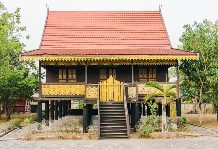 Rumah Panggung Kajang LakoThis is the principal traditional house of Jambi, a stilt house built on sturdy wooden pillars, primarily designed for safety against floods and wild animals. The name Kajang Lako refers to the curved roof shape that resembles a boat (a common feature in river-based communities). A defining feature is its rounded back veranda (Pentukang). The entire structure is divided into eight main rooms (ruang), with the layout reflecting social hierarchy and the rules of the community.
