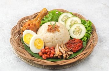 Nasi Gemuk: A savory rice dish similar to Nasi Uduk or Nasi Lemak, cooked with coconut milk and served with hard-boiled egg, peanuts, anchovies, and chili sauce.