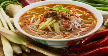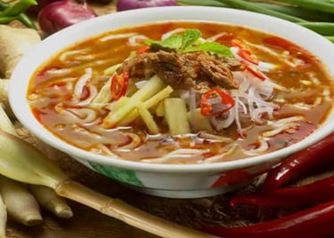 Lakse Kuah: Noodles cooked in a thick, savory fish curry sauce made with coconut milk.