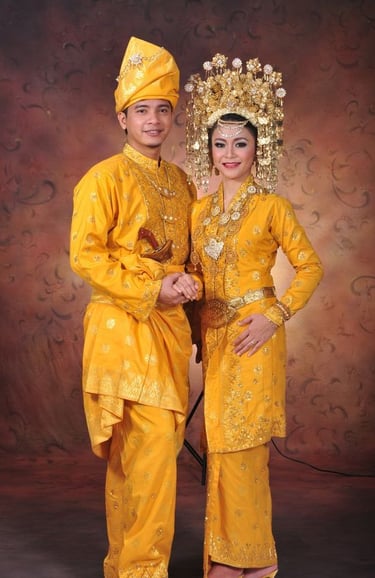 Baju Kurung and Kebaya LabuhWomen typically wear the Baju Kurung, a loose-fitting, long-sleeved blouse that is modest and elegant. The Kebaya Labuh is a variation that is cut longer, covering the hips down to the knees. Both tops are paired with an exquisitely woven Songket fabric as the skirt, and the entire outfit is often adorned with gold jewelry.