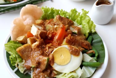 Gado-Gado: Although popular throughout Indonesia, Jakarta's version is particularly famous. It is a mixed vegetable salad (boiled potatoes, sprouts, long beans, tofu, tempeh) topped with a rich, slightly sweet, and chunky peanut sauce and served with kerupuk (crackers).