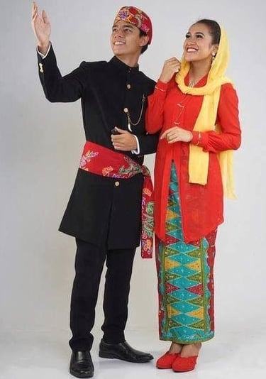 Dandanan Care Haji (Hajj-like Attire) This is the elaborate wedding attire, heavily influenced by Betawi, Chinese, and Middle Eastern (Hajj) aesthetics, reflecting Jakarta’s multicultural history. The female bride wears a heavily adorned Kebaya and a ceremonial cloth over her face, topped with a grand, tiered headpiece called Sanggul Kodok (Frog Bun). The male groom wears a Jubah (long robe), similar to Middle Eastern attire, often paired with a fringed shawl and a turban-like head covering.
