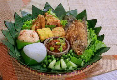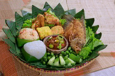 Nasi Timbel: Steamed rice that is compacted and wrapped tightly in a banana leaf, giving it a unique aroma. It is typically served with lalapan (raw vegetables), sambal, fried chicken, and tempeh/tofu.