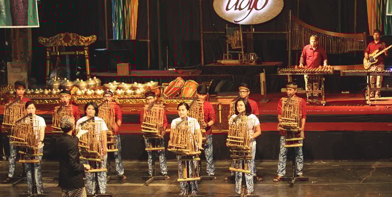 Angklung: A traditional musical instrument made of two bamboo tubes attached to a bamboo frame, shaken to produce a single note. Playing a melody requires a group of players, symbolizing communal cooperation.