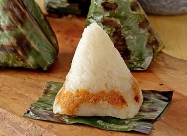 Pengkang: A traditional savory snack from the coastal area (Mempawah). Sticky rice is mixed with dried shrimp (ebi) or fish, wrapped tightly in banana leaves in a triangular shape, then grilled over charcoal.